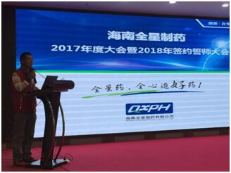 海南全星制藥2017年度大會(huì)暨2018年簽約誓師大會(huì)圓滿(mǎn)結(jié)束2017年12月25-28日,海南全星制藥有限公司于??谟兰未缶频暾匍_(kāi)了2017年度大會(huì)暨2018年簽約誓師大會(huì)。大會(huì)以“新起點(diǎn)·轉(zhuǎn)型·創(chuàng)新·合規(guī)”為主題,總結(jié)2017年銷(xiāo)售工作及存在問(wèn)題,并對(duì)2018年做出了詳盡的銷(xiāo)售工作計(jì)劃。會(huì)議在暖場(chǎng)片及參會(huì)人員熱烈的掌聲中拉開(kāi)帷幕。